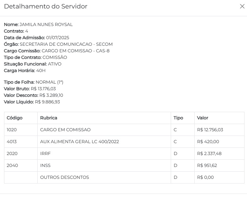 comissão que ela ocupava no governo do Acre. A influenciadora recebia salário bruto de R$ 13,1 mil e era acusada por servidores da pasta onde estava lotada de não trabalhar.
