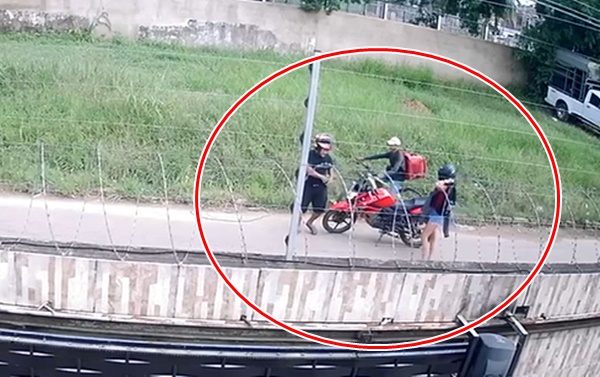 Câmeras de segurança registraram o momento em que um casal, usando uma motocicleta de cor vermelha, assalta um ciclista entregador na manhã desta quinta-feira (8), por volta das 8h, na Travessa Guarani, no bairro Aviário, em Rio Branco. O crime ocorreu nas proximidades do muro do Campo do Independência.