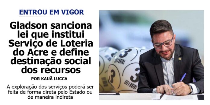 O governador Gladson Camelí (PP), sancionou a Lei nº 4.771, de 19 de janeiro de 2026, que institui oficialmente o Serviço de Loteria do Estado do Acre. A nova legislação estabelece as bases legais para a exploração de serviços lotéricos no âmbito estadual, com finalidade de gerar recursos para o financiamento de políticas públicas e ações socialmente relevantes. A medida foi publicada na edição desta segunda-feira, 26, do Diário Oficial do Estado (DOE).