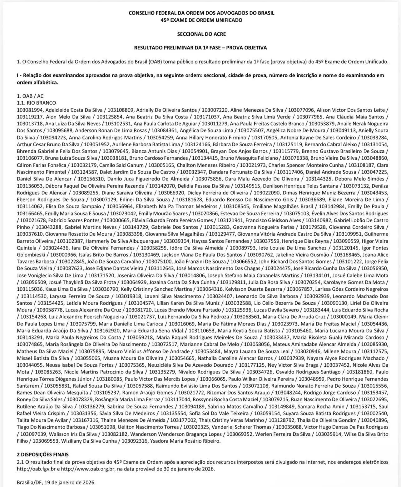 De acordo com o documento publicado pelo Conselho Federal da OAB, o resultado apresenta a relação dos examinados aprovados na primeira etapa, organizada por seccional, cidade de prova, número de inscrição e nome do candidato, em ordem alfabética. No Acre, os aprovados realizaram a prova na capital Rio Branco.