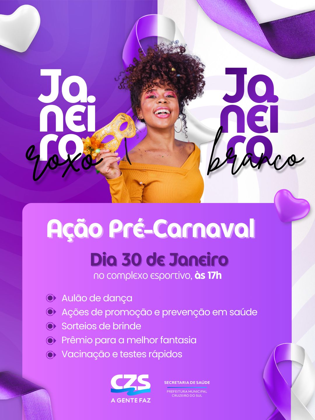 A Prefeitura de Cruzeiro do Sul, por meio da Secretaria Municipal de Saúde, realizará nesta sexta-feira, 30, a partir das 17h, no Complexo Esportivo, uma grande ação de saúde em formato de pré-carnaval. A iniciativa integra as campanhas do Janeiro Branco, voltada à promoção da saúde mental, e do Janeiro Roxo, de conscientização e combate à hanseníase e à tuberculose.