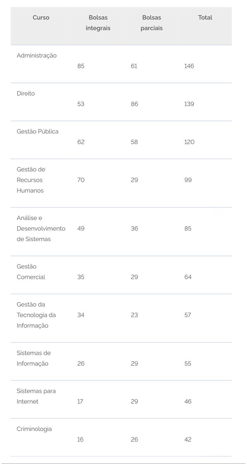 Entre os cursos com maior número de oportunidades no Acre, Administração lidera a oferta, com 146 bolsas, sendo 85 integrais e 61 parciais. Em seguida aparecem Direito, com 139 bolsas (53 integrais e 86 parciais), e Gestão Pública, com 120 bolsas (62 integrais e 58 parciais).