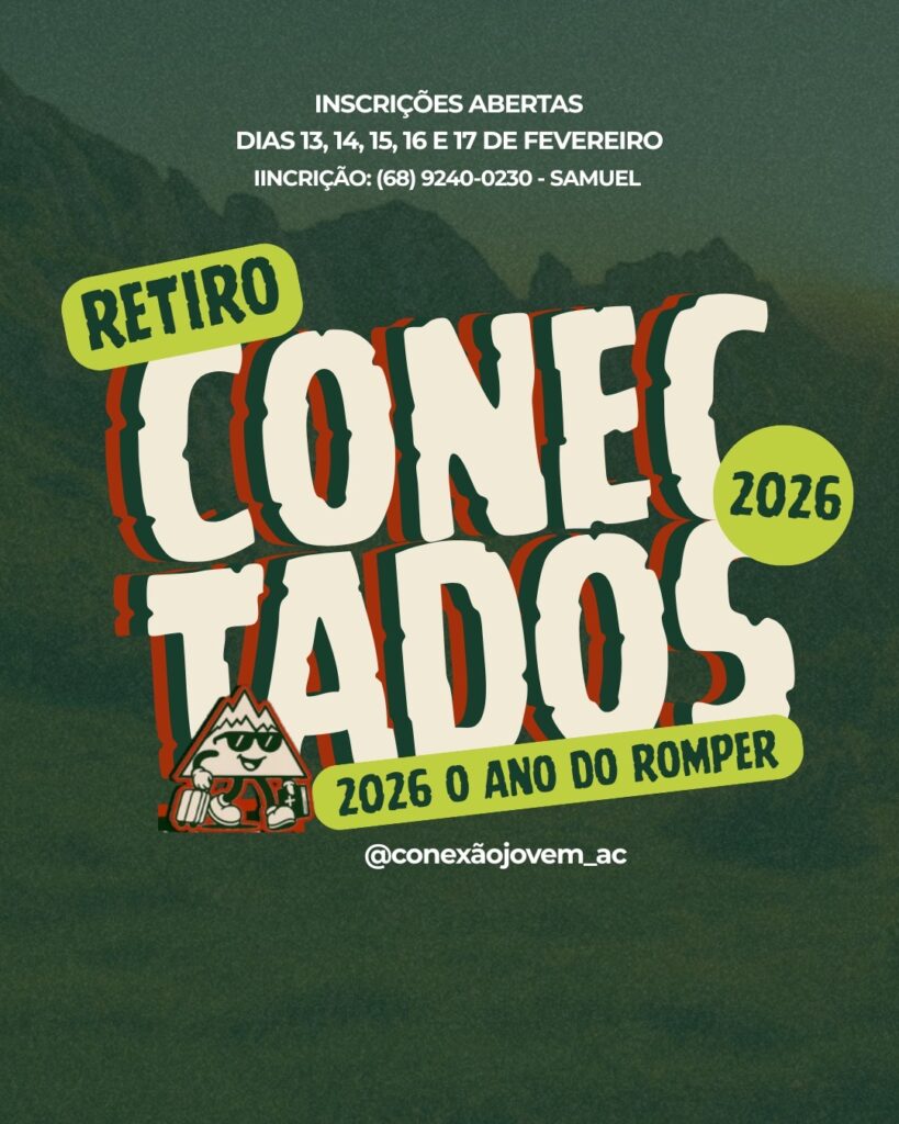 Mais informações sobre o Retiro Conectados 2026 e atualizações da programação podem ser acompanhadas pelo Instagram oficial do movimento, @conexaojovem_ac. A coordenação reforça que as vagas são limitadas e orienta os interessados a garantirem a inscrição o quanto antes.