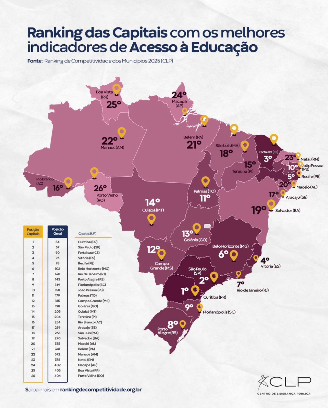 Rio Branco aparece na 16ª colocação no ranking das capitais com os melhores indicadores de acesso à educação no Brasil. Os dados divulgados nesta quinta-feira, 22, integram o Ranking de Competitividade dos Municípios 2025, elaborado pelo Centro de Liderança Pública (CLP), e avaliam a capacidade das cidades de garantir vagas, infraestrutura educacional e permanência de crianças e jovens na escola.