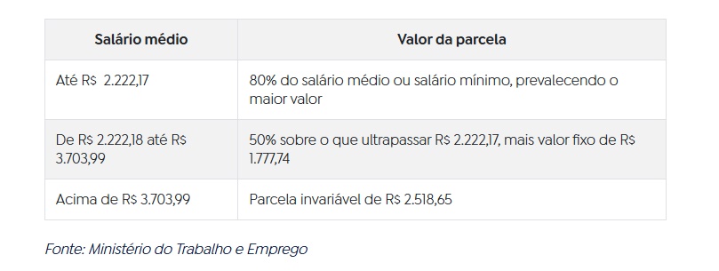 A parcela do seguro-desemprego é calculada com base na média das três últimas remunerações do trabalhador antes da demissão. Após a correção das faixas salariais, o benefício será definido da seguinte forma: