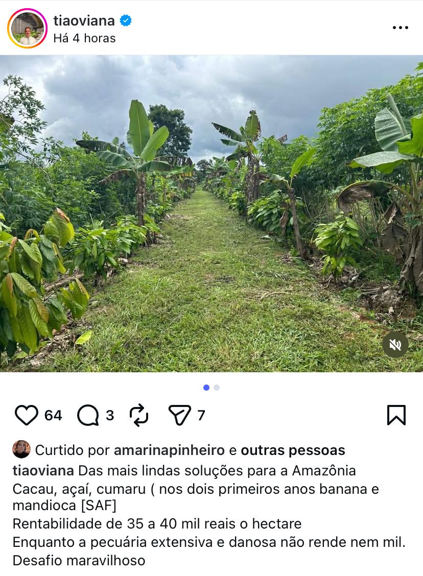 O ex-governador do Acre, Tião Viana (PT), fez uma publicação nas redes sociais afirmando que o cultivo de cacau, açaí, cumaru, banana e mandioca rendem mais que a criação de gado quando comparado a rentabilidade por hectare.