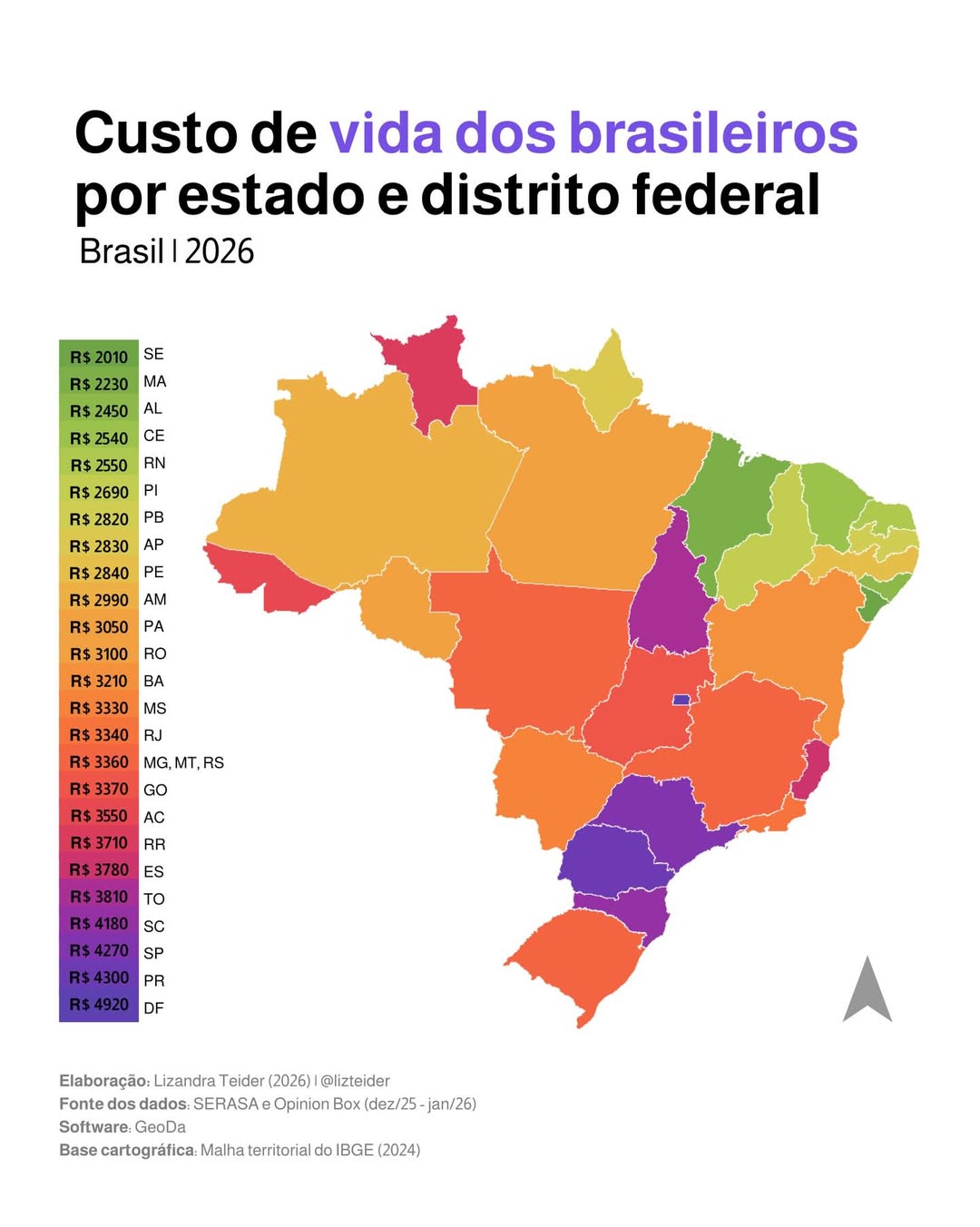 O estudo considera despesas básicas mensais, como moradia, alimentação, transporte, saúde e serviços essenciais. No recorte nacional, o Distrito Federal lidera o ranking, com custo médio de R$ 4.920, seguido por Paraná (R$ 4.300) e São Paulo (R$ 4.270).