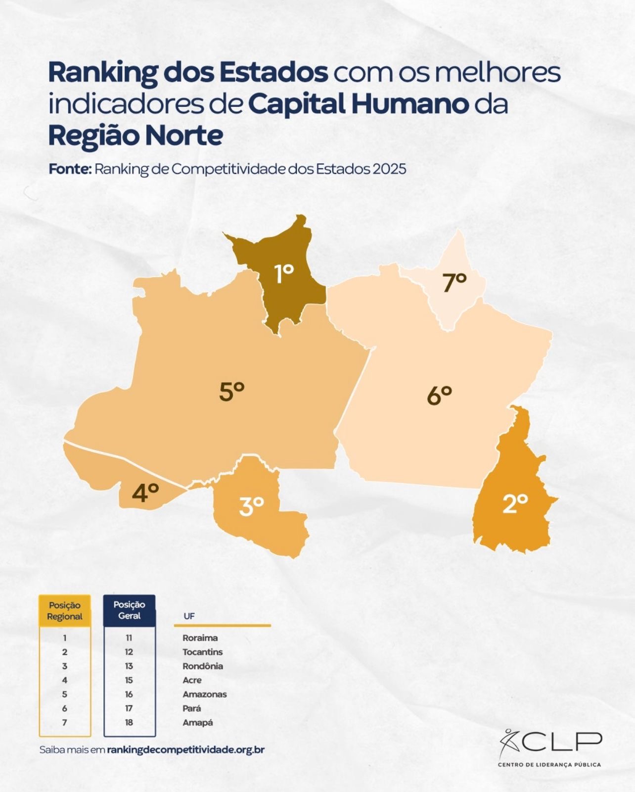 O ranking regional é liderado por Roraima, que ocupa o 1º lugar na Região Norte e a 11ª posição no país. Na sequência aparecem Tocantins (2º regional e 12º geral) e Rondônia (3º regional e 13º geral). Depois do Acre, figuram Amazonas (5º regional e 16º geral), Pará (6º regional e 17º geral) e Amapá (7º regional e 18º geral).