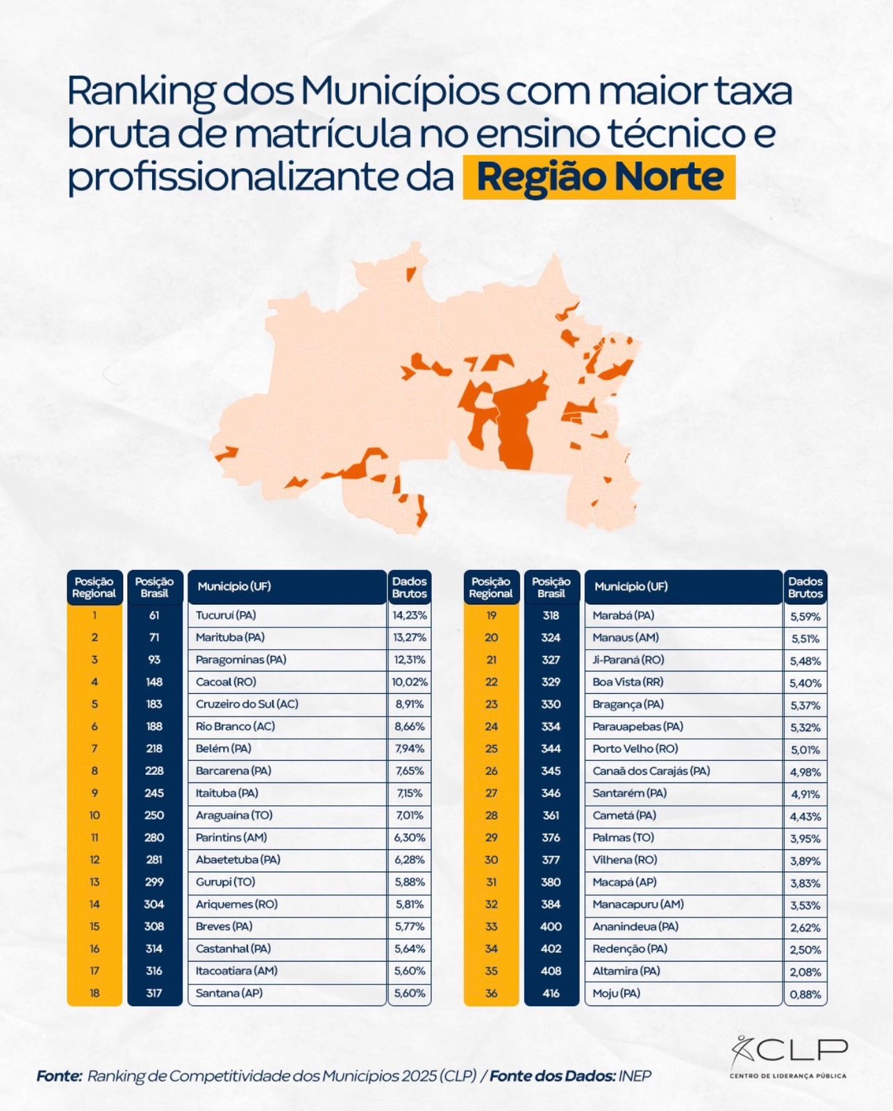 Os municípios de Cruzeiro do Sul e Rio Branco, no Acre, figuram entre as melhores posições da Região Norte no ranking de taxa bruta de matrícula no ensino técnico e profissionalizante, segundo dados do Ranking de Competitividade dos Municípios 2025, elaborado pelo Centro de Liderança Pública (CLP) com base em informações do Instituto Nacional de Estudos e Pesquisas Educacionais Anísio Teixeira (Inep).