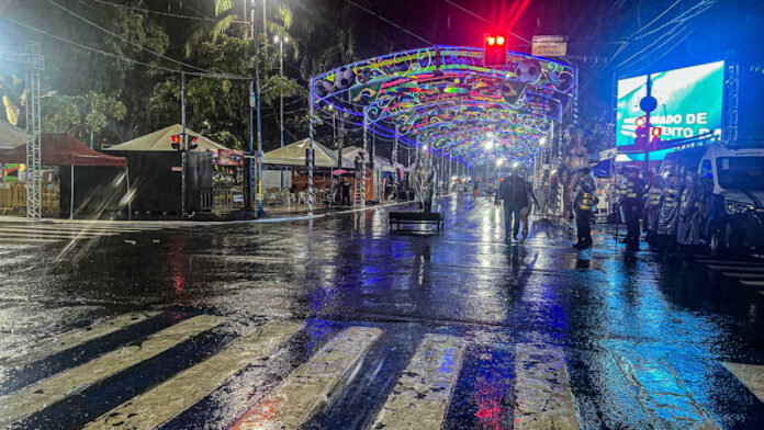 A forte chuva que atingiu Rio Branco na noite desta segunda-feira, 16, provocou a suspensão do desfile do Concurso de Blocos do Carnaval Rio Branco Folia 2026. A decisão foi tomada após a apresentação da Unidos do Fuxico, única agremiação que conseguiu desfilar antes do agravamento das condições climáticas.