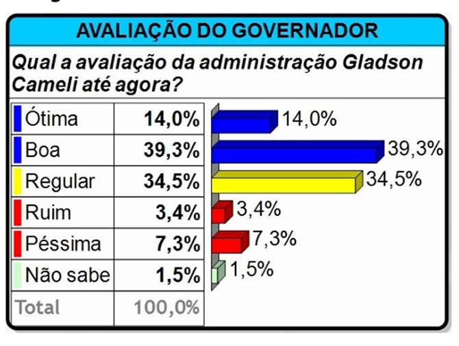 De acordo com os dados detalhados da pesquisa, 14% dos entrevistados avaliam a gestão como ótima e 39,3% como boa, somando o índice de aprovação. Já 3,4% consideram o governo ruim e 7,3% classificam como péssimo.