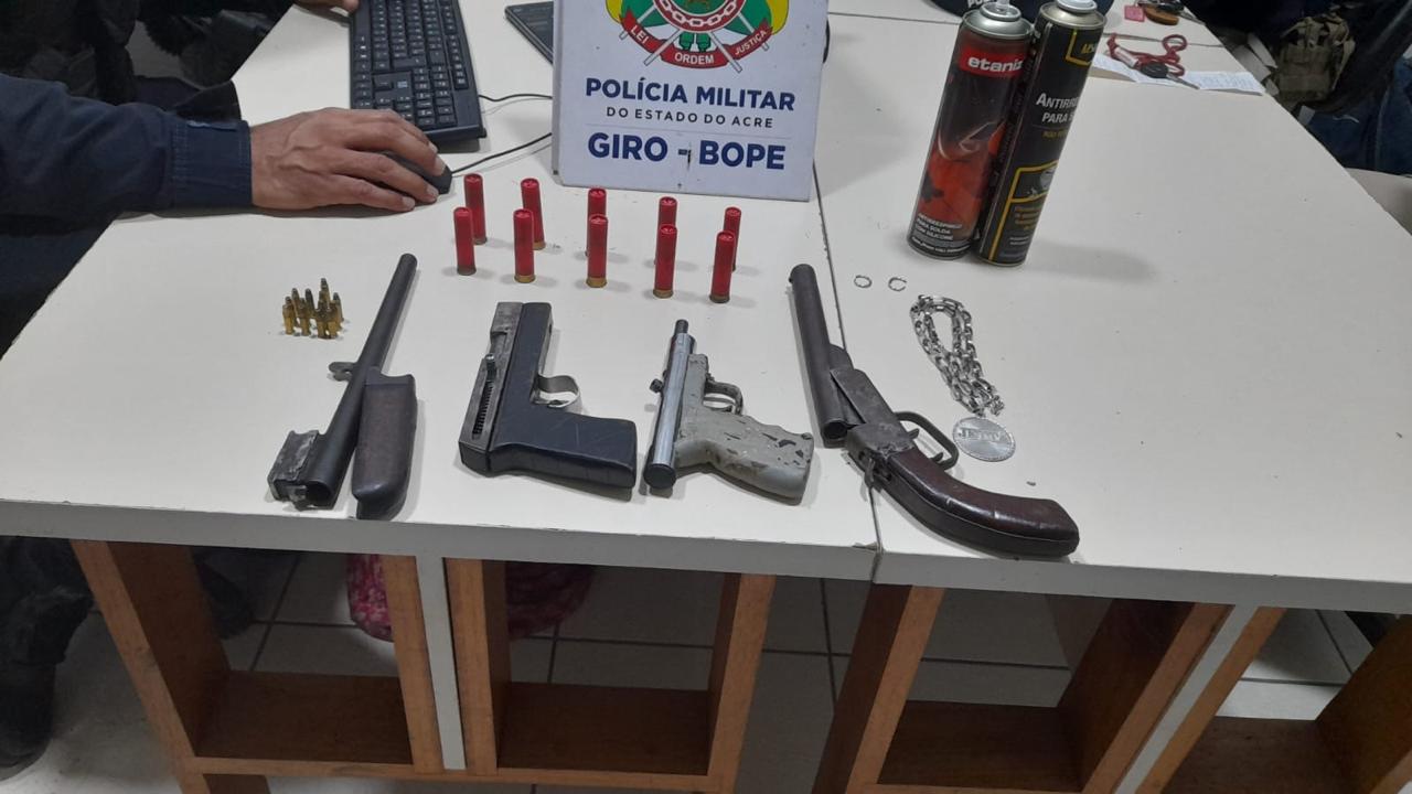 Uma ação rápida dos Cavaleiros de Aço, do GIRO, do Batalhão de Operações Especiais (BOPE), resultou na apreensão de um adolescente de 16 anos e de três armas de fogo na noite do último sábado (14) no bairro Rosa Linda, em Rio Branco.