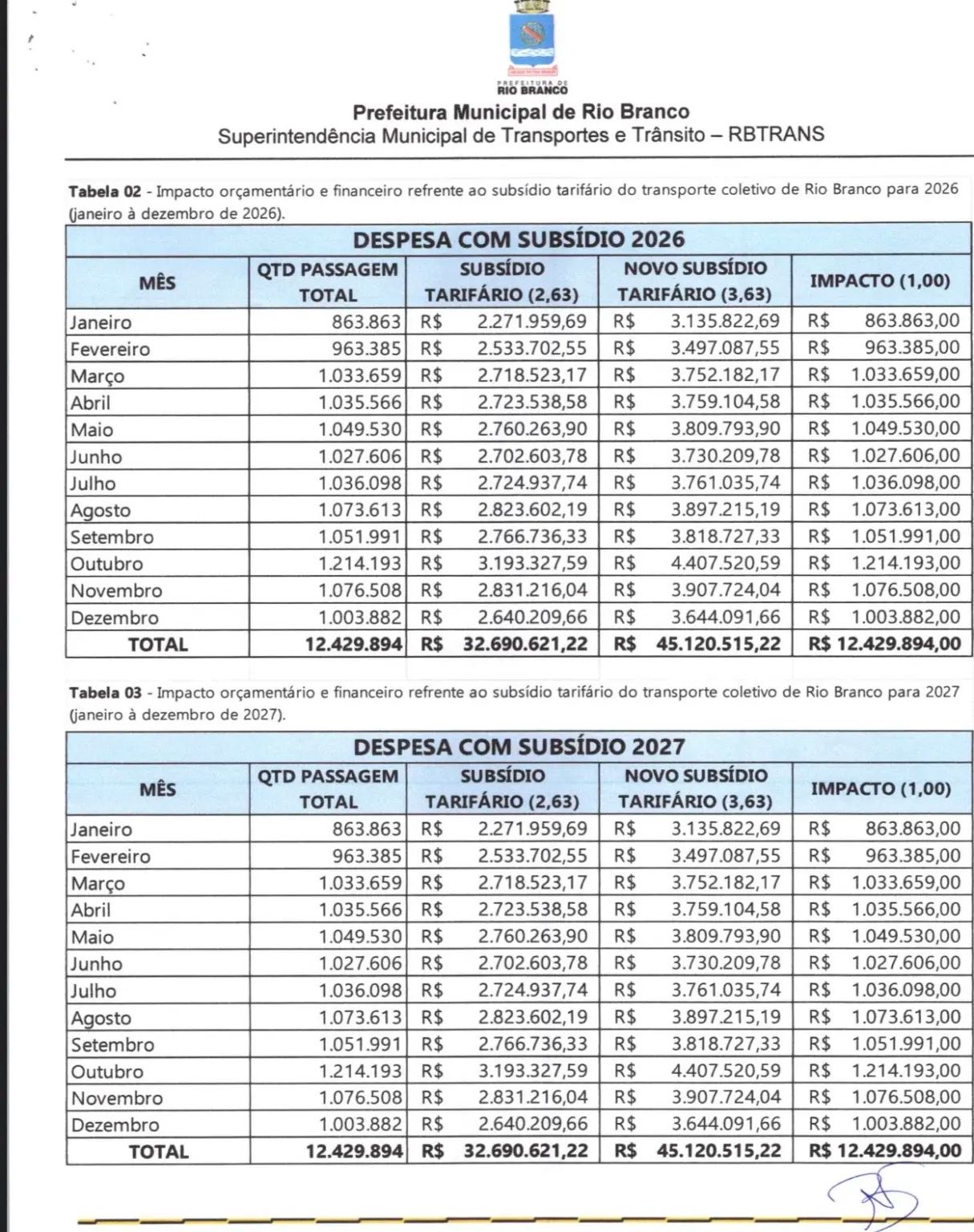 Para os anos de 2026 e 2027, a previsão orçamentária é de R$ 12,4 milhões por exercício, valores que devem constar na Lei Orçamentária Anual (LOA). Com a ampliação do subsídio, o repasse da prefeitura à empresa passou a variar entre R$ 2,63 e R$ 3,63 por passageiro transportado.