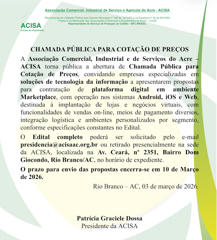 A Associação Comercial, Industrial e de Serviços do Acre (ACISA) anunciou a abertura de Chamada Pública para Cotação de Preços com o objetivo de contratar uma plataforma digital em ambiente Marketplace. A iniciativa visa fortalecer o comércio local por meio da implantação de lojas e negócios virtuais com operação nos sistemas Android, iOS e Web.