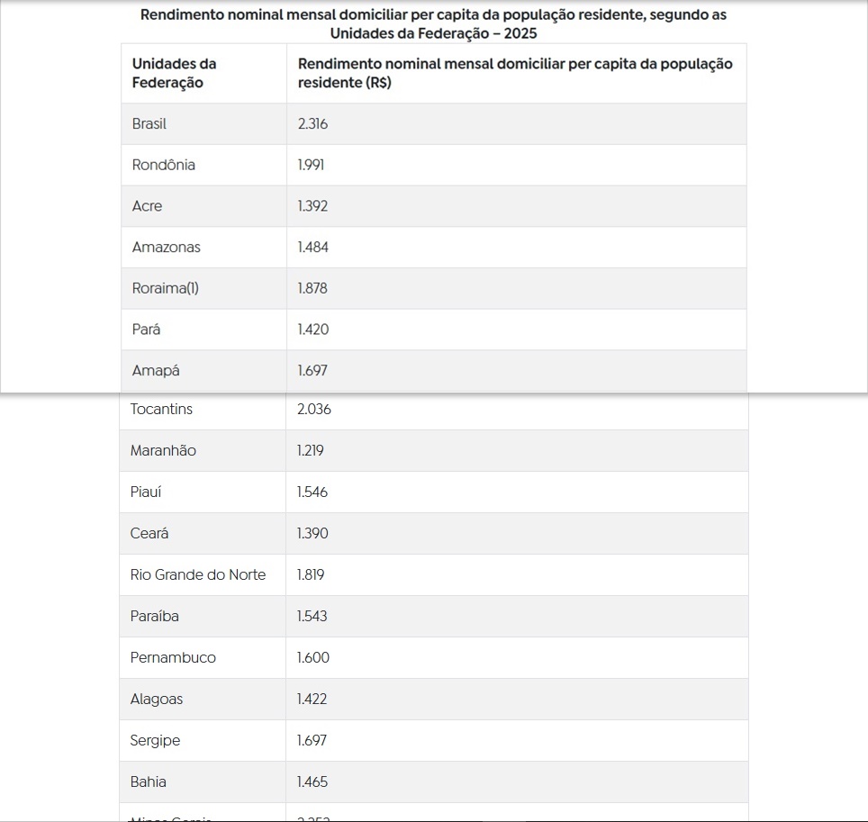 O rendimento domiciliar per capita para o Brasil, em 2025, ficou em R$ 2.316. O valor representa um avanço em relação a 2024, quando a renda média dos residentes no país ficou em R$ 2.069. Foi maior também na comparação com anos anteriores: R$ 1.893, em 2023, e R$ 1.625, em 2022.