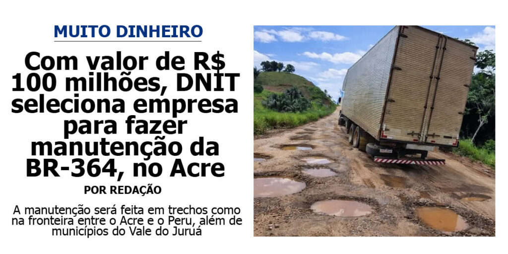 O Departamento Nacional de Infraestrutura de Transportes (DNIT) publicou o resultado do pregão eletrônico que escolhe a empresa para fazer a manutenção em trechos da BR-364 no Acre que somam 80,80 km. A decisão foi publicada no Diário Oficial da União de segunda-feira (23).