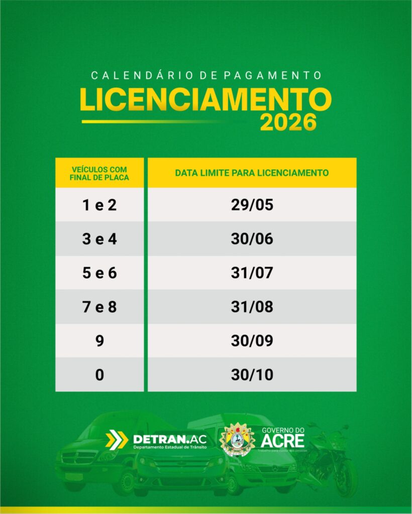O Departamento Estadual de Trânsito do Acre (Detran/AC) publicou, nesta terça-feira, 17, a Portaria nº 230, que estabelece novos prazos para o pagamento do Licenciamento Anual de Veículos automotores em todo o estado, referente ao exercício de 2026.