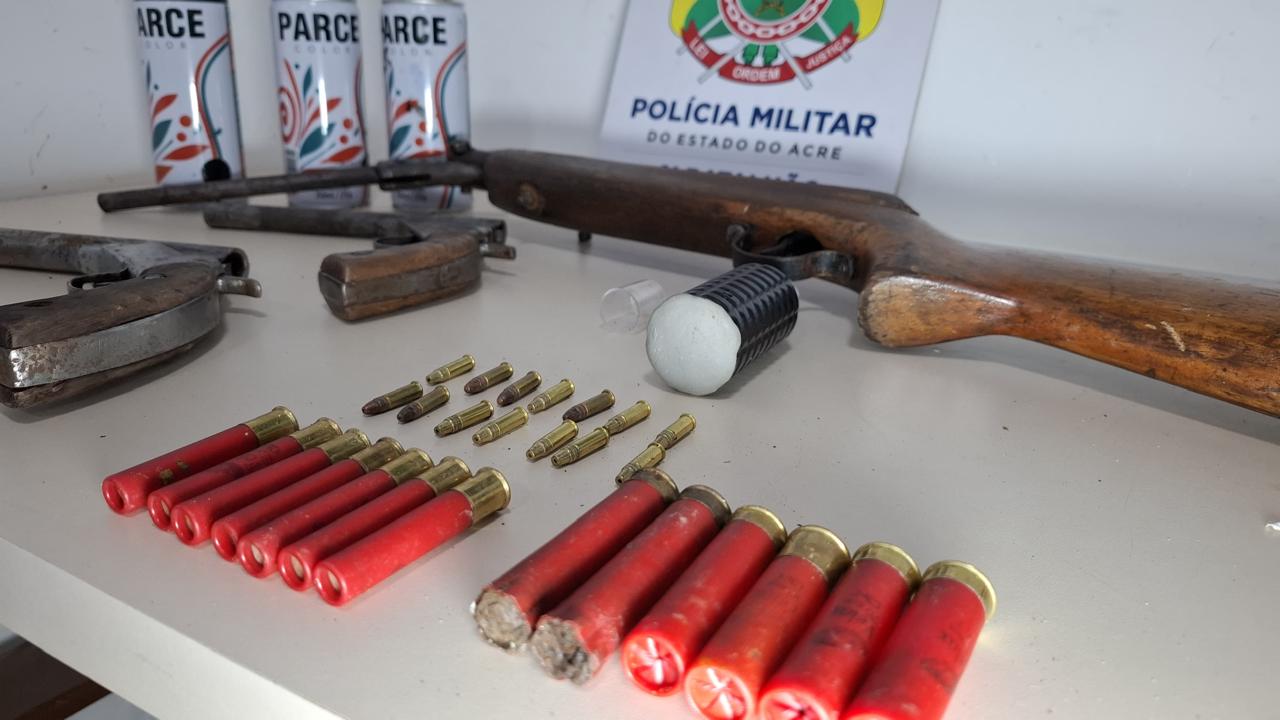 Entre o material apreendido estavam uma escopeta calibre .28, uma escopeta calibre .36 e uma carabina calibre .22, além de uma granada caseira e frascos de tinta spray.