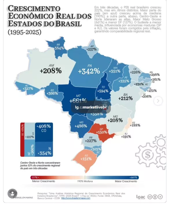 A economia brasileira registrou crescimento real de 222% entre 1995 e 2025, mas o avanço ocorreu de forma desigual entre os estados. É o que aponta o estudo “Uma Análise Histórica Regional do Crescimento Econômico Real nos Estados Brasileiros (1995–2025)”, divulgado pela plataforma Brasil em Mapas.