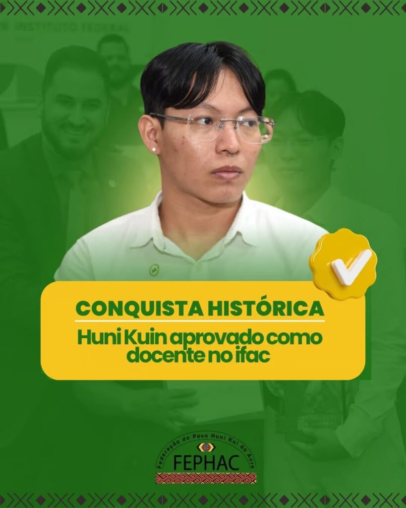 A Federação do Povo Huni Kuĩ do Acre (FEPHAC) anunciou, na segunda-feira, 30, a aprovação de Clécio Ferreira Nunes Huni Kuĩ, conhecido em língua Hãtxa Kuĩ como Muru Inu Bake, para o cargo de docente EBTT na área de Letras/Inglês do Instituto Federal do Acre (Ifac).