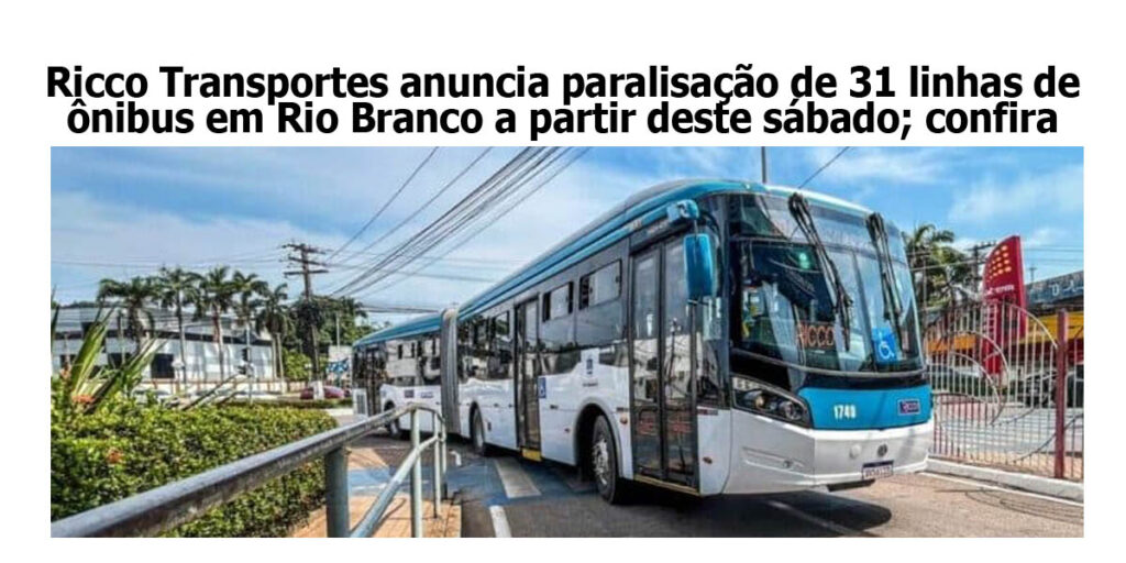A empresa Ricco Transportes que opera o sistema de transporte coletivo em Rio Branco comunicou através de suas redes sociais, na noite de sexta-feira (13), a paralisação de 31 linhas de ônibus na capital acreana a partir deste sábado (14).