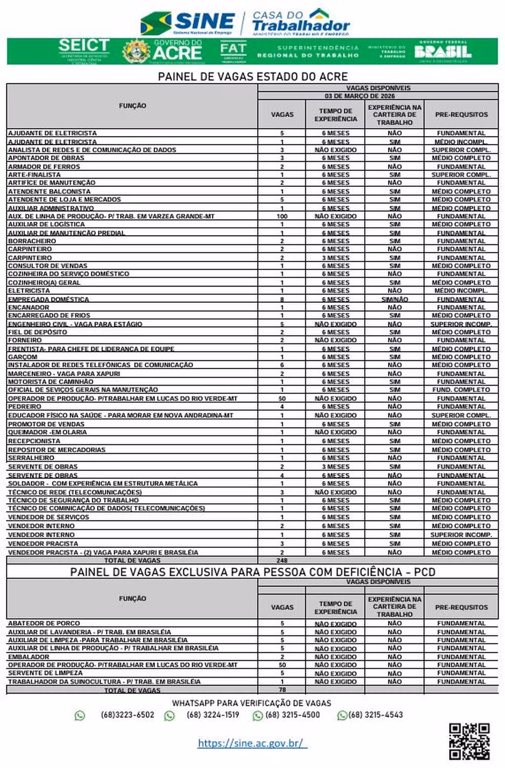 O Sistema Nacional de Emprego do Acre (Sine) oferta 326 vagas, sendo 78 delas exclusivas para Pessoas Com Deficiência (PCD), em diversas áreas nesta terça-feira (3) em Rio Branco.