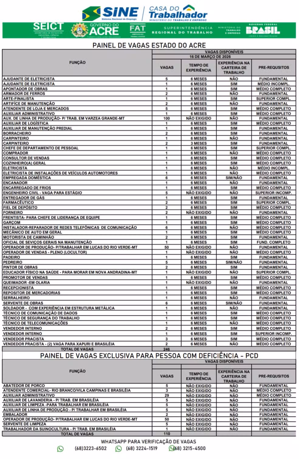 O Sistema Nacional de Emprego do Acre (Sine) oferta 356 vagas, sendo 110 delas exclusivas para Pessoas Com Deficiência (PCD), em diversas áreas nesta segunda-feira (16) em Rio Branco.