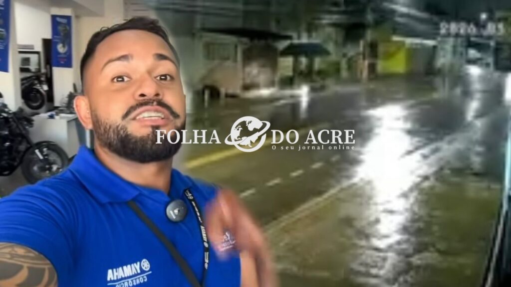 Imagens do circuito de segurança de um estabelecimento comercial mostram a pista molhada no momento do acidente.