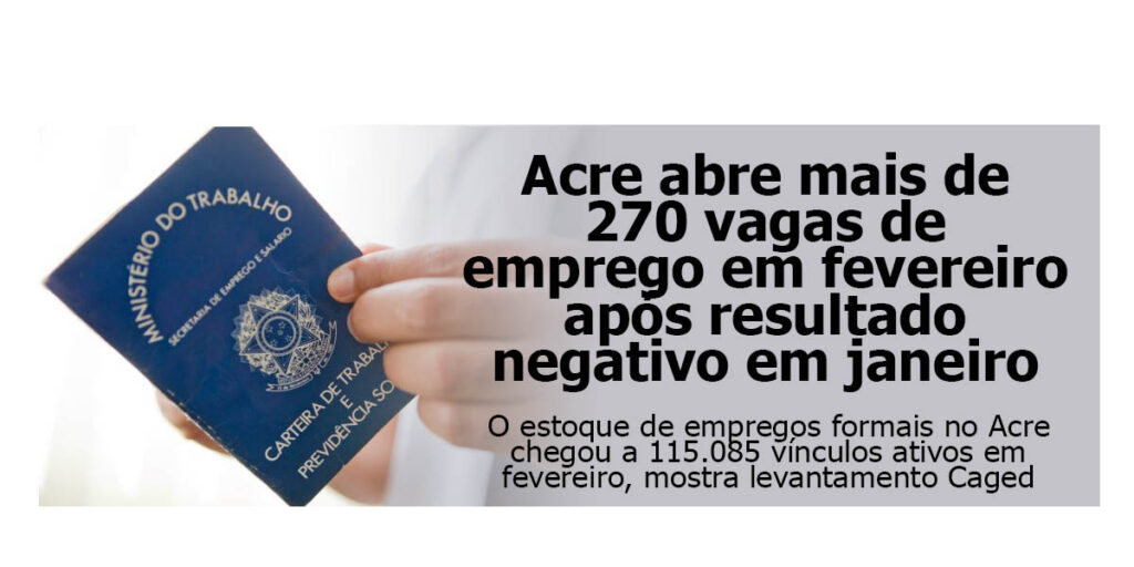 O Acre voltou a registrar saldo positivo na geração de empregos formais em fevereiro de 2026, com a criação de 276 vagas com carteira assinada, segundo dados do Novo Cadastro Geral de Empregados e Desempregados (Novo Caged), divulgados pelo Ministério do Trabalho e Emprego (MTE). No período, foram contabilizadas 5.170 admissões e 4.894 desligamentos.