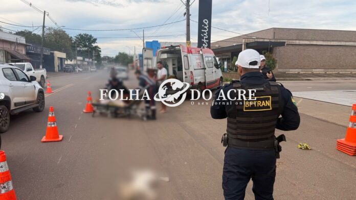 A motociclista Brenda Oliveira, de 28 anos, ficou ferida após sofrer um acidente de moto na manhã desta terça-feira (28) na avenida Getúlio Vargas, no Conjunto Solar, em Rio Branco.