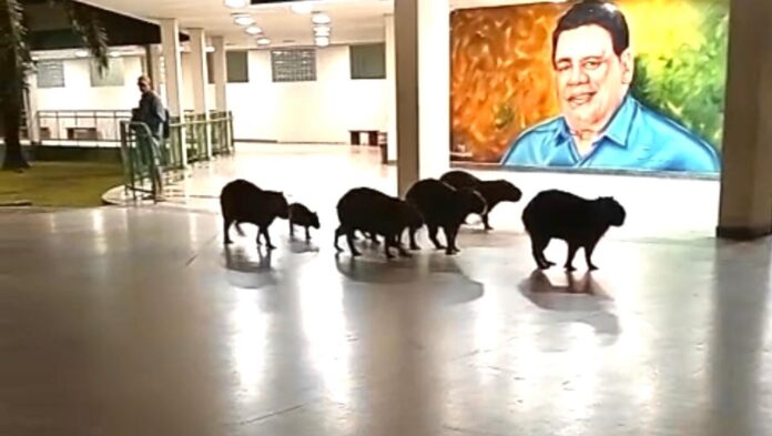 Nas imagens, 10 capivaras passam normalmente pela entrada da unidade hospitalar. A cena chamou atenção das pessoas que presenciaram o episódio.