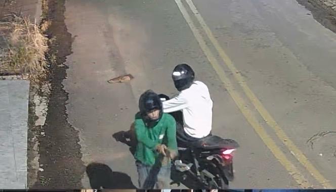 Imagens de câmeras de vídeo monitoramento mostram uma dupla se aproximando da mulher que estava próxima da motocicleta, o garupa de blusa verde desce com arma em punho e anuncia o assalto, pega a motocicleta e saem tomando rumo ignorado.