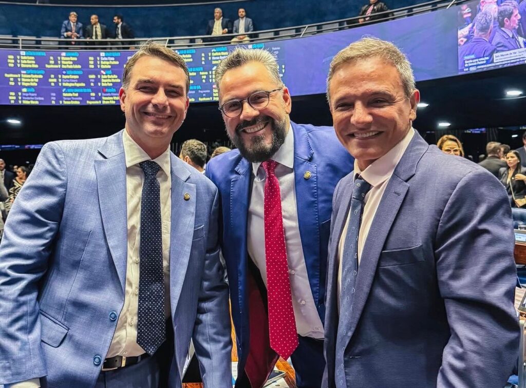 O senador Márcio Bittar (PL) foi registrado em uma foto no plenário do Senado Federal nesta quarta-feira, 15, ao lado do senador Alan Rick (Republicanos-AC) e do pré-candidato à presidência da República Flávio Bolsonaro (PL-RJ).