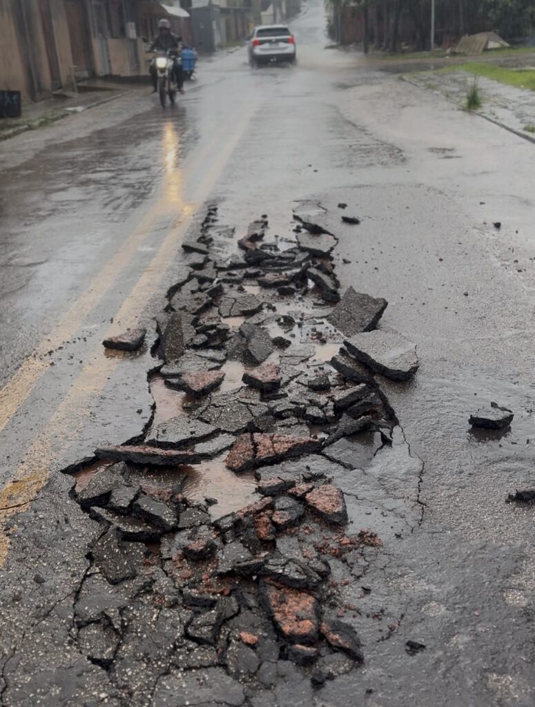 Parte do asfalto da rua também foi danificado por causa da chuva e um possível rompimento da rede de água no local, autoridades foram acionadas.