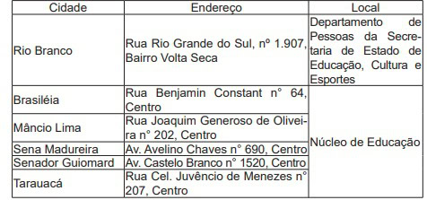 O governo do Acre, por meio da Secretaria de Administração (Sead) e da Secretaria de Educação e Cultura (SEE), publicou no Diário Oficial desta quinta-feira, 9, editais de convocação para candidatos aprovados em processos seletivos simplificados. As convocações abrangem a educação escolar indígena e o ensino rural e urbano.
