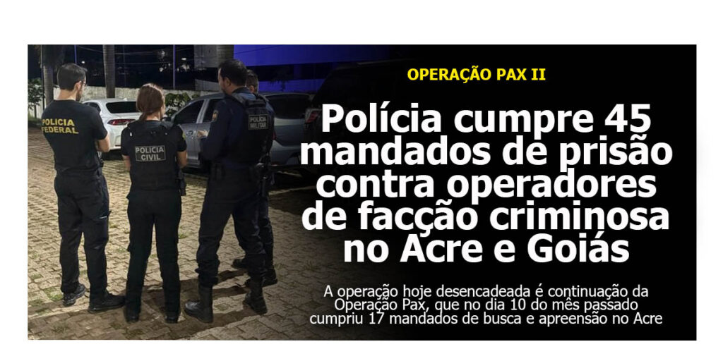 A operação cumpre 45 mandados de prisão preventiva e 4 de busca e apreensão domiciliar, em endereços localizados no estado do Acre, nas cidades de Rio Branco e Sena Madureira, e no estado de Goiás, em Goianira.