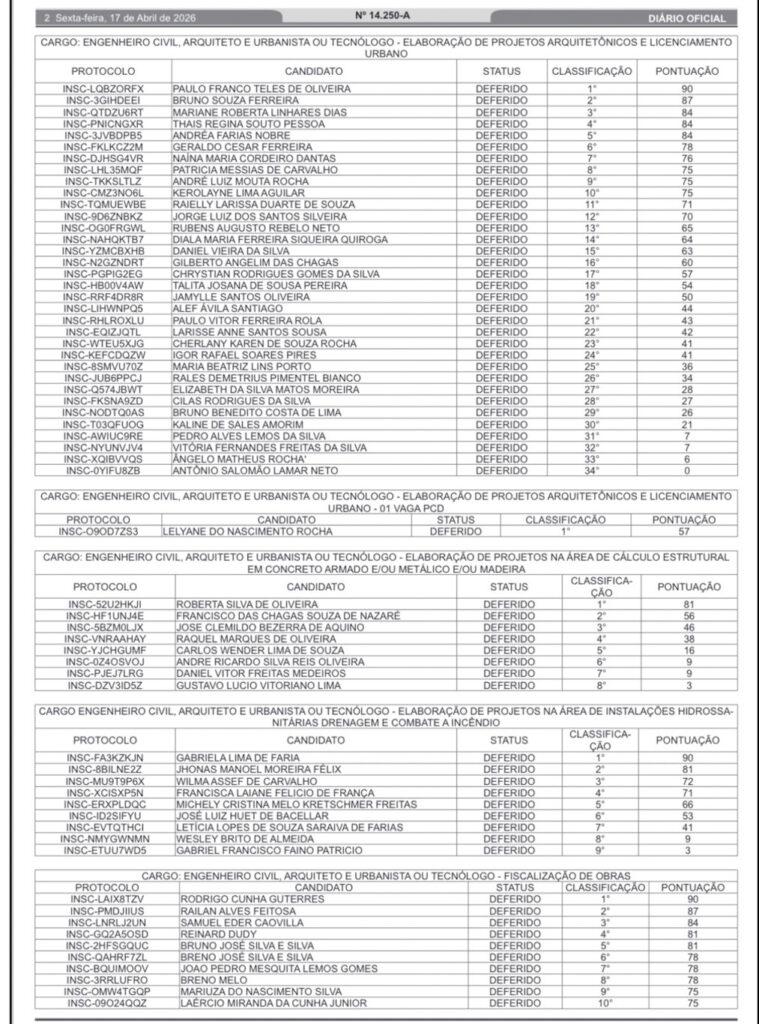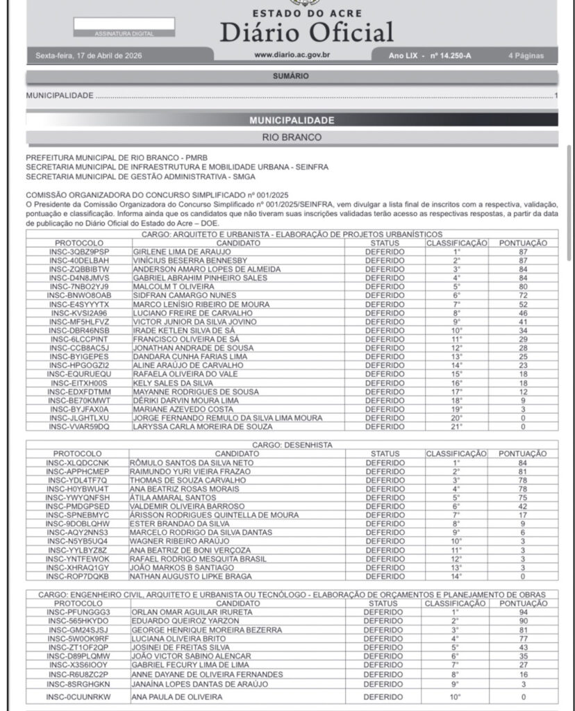 A Prefeitura de Rio Branco publicou, em edição extra do Diário Oficial desta sexta-feira, 17, o resultado final do Concurso Simplificado nº 001/2025 da Secretaria Municipal de Infraestrutura e Mobilidade Urbana (Seinfra). A lista traz a relação definitiva dos candidatos inscritos, com validação, pontuação e classificação para diversas áreas técnicas.