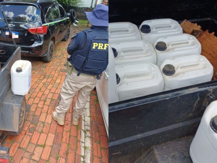 Durante fiscalização de rotina, os agentes abordaram um veículo modelo GM Spin, que operava como táxi. No automóvel, além de um passageiro, foram encontrados 12 galões de 20 litros cada, totalizando 240 litros de substâncias classificadas como perigosas pela Organização das Nações Unidas (ONU 3082 – Classe de Risco 9).