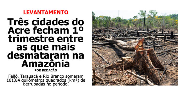 Três cidades do Acre aparecem entre as 10 que mais desmataram na Amazônia entre agosto de 2025 e março deste ano, segundo um levantamento do Instituto do Homem e Meio Ambiente da Amazônia (Imazon) divulgaram nessa segunda-feira (27). Feijó, Tarauacá e Rio Branco somaram 101,84 quilômetros quadrados (km²) de derrubadas no período.