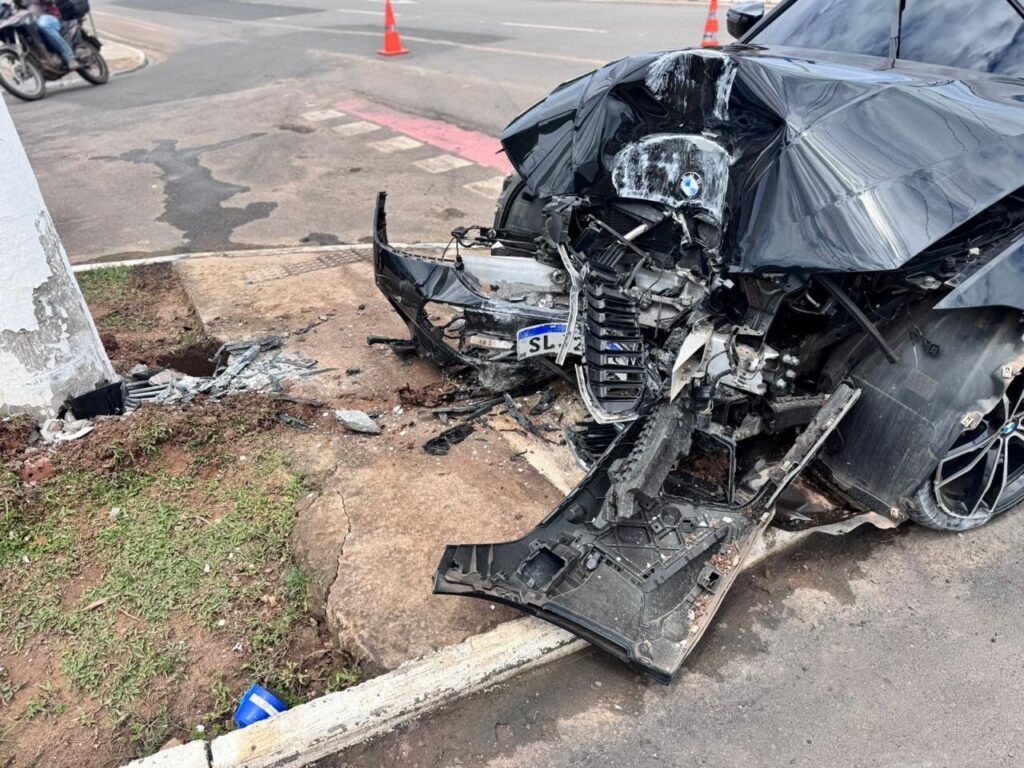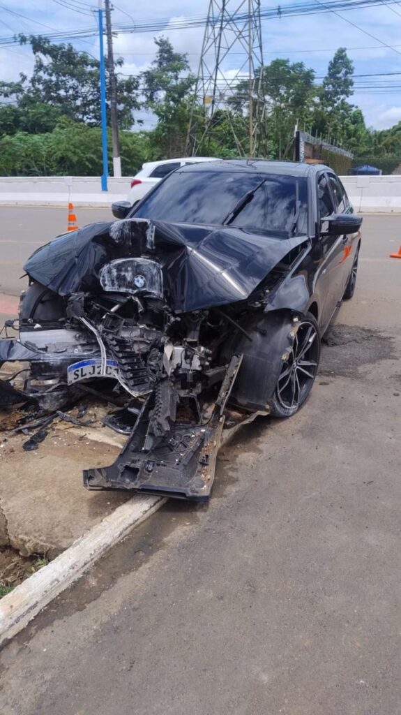 Um veículo de luxo, modelo BMW, ficou com a parte frontal completamente destruída após colidir contra um poste na manhã deste domingo de Páscoa (5), na estrada Dias Martins, em Rio Branco.